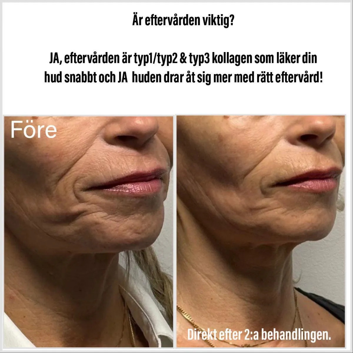 Behandlingen stimulerar kollagen och elastin på djupet, vilket ger en synlig uppstramning och föryngring av huden. Du kan uppleva ett resultat direkt – och huden fortsätter att förbättras i upp till 6 månader.